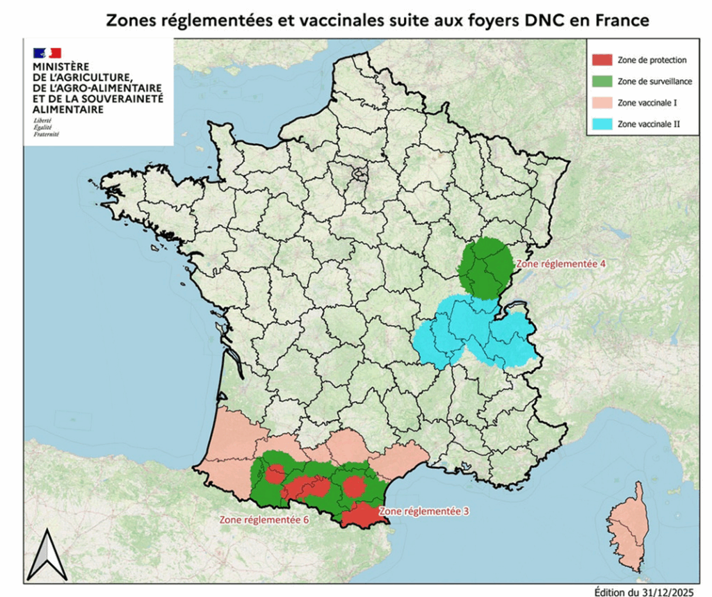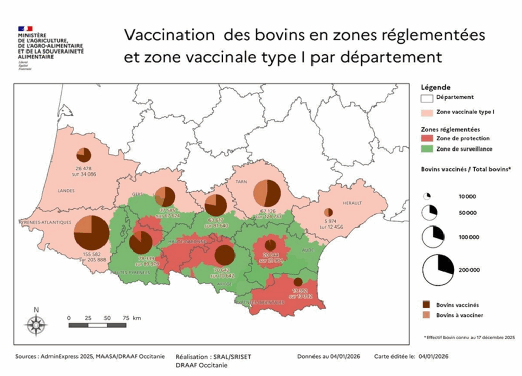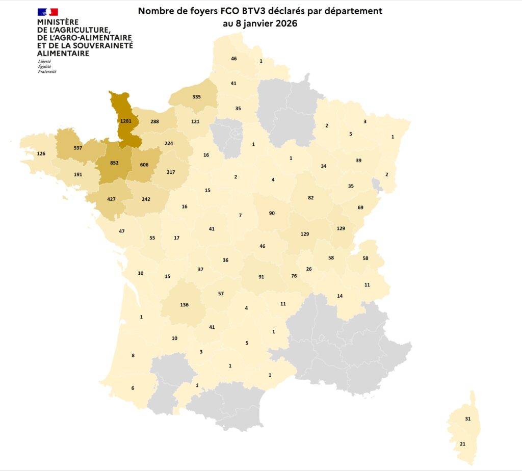 Entre le 1er juin et le 8 janvier 2026, 3 276 foyers de FCO, sérotype 8, ont été recensés en France (+3 foyers depuis la semaine dernière)