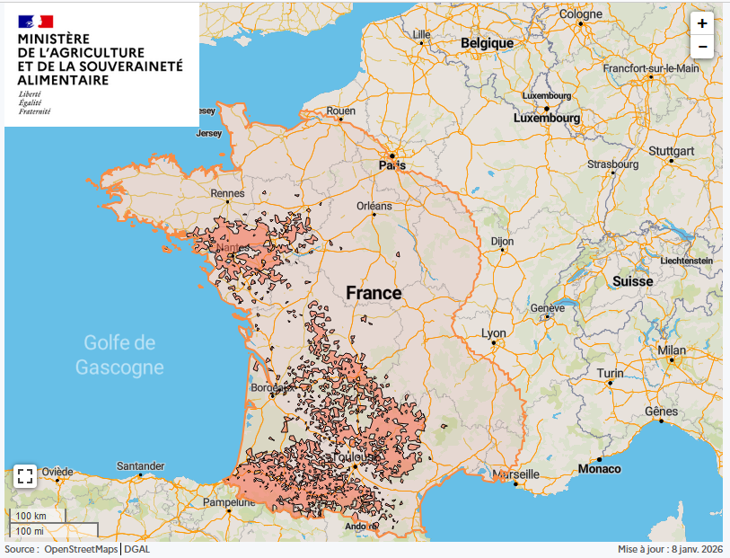 Espagne : Au total, 19 foyers ont été détectés depuis le 01/10/2025. Dernier foyer détecté le 08/01/2026
