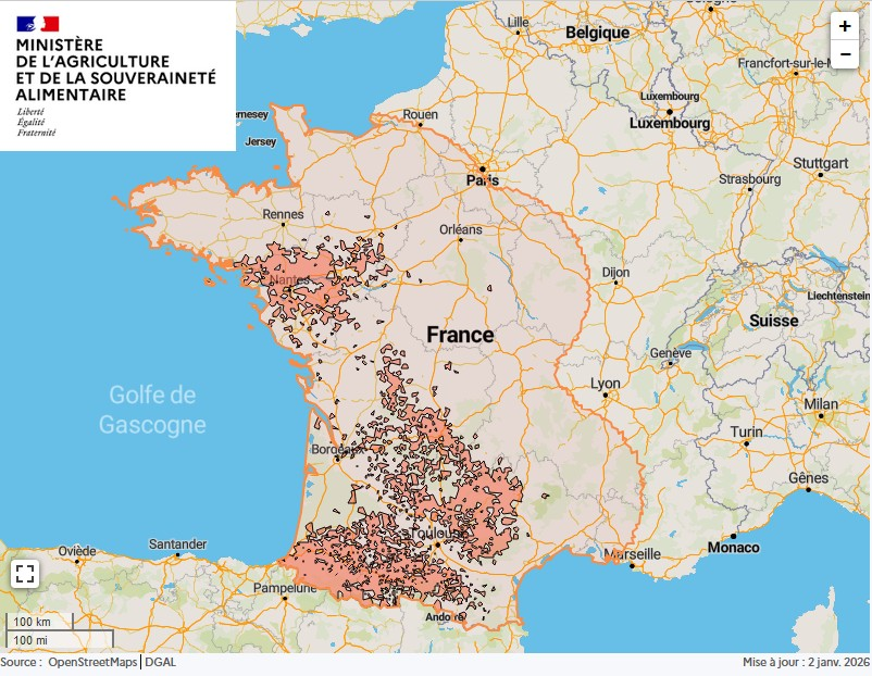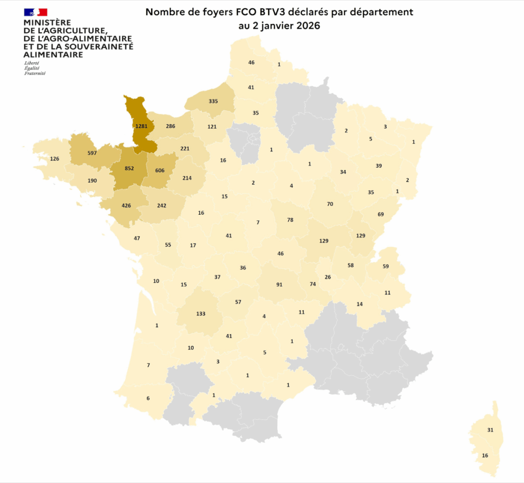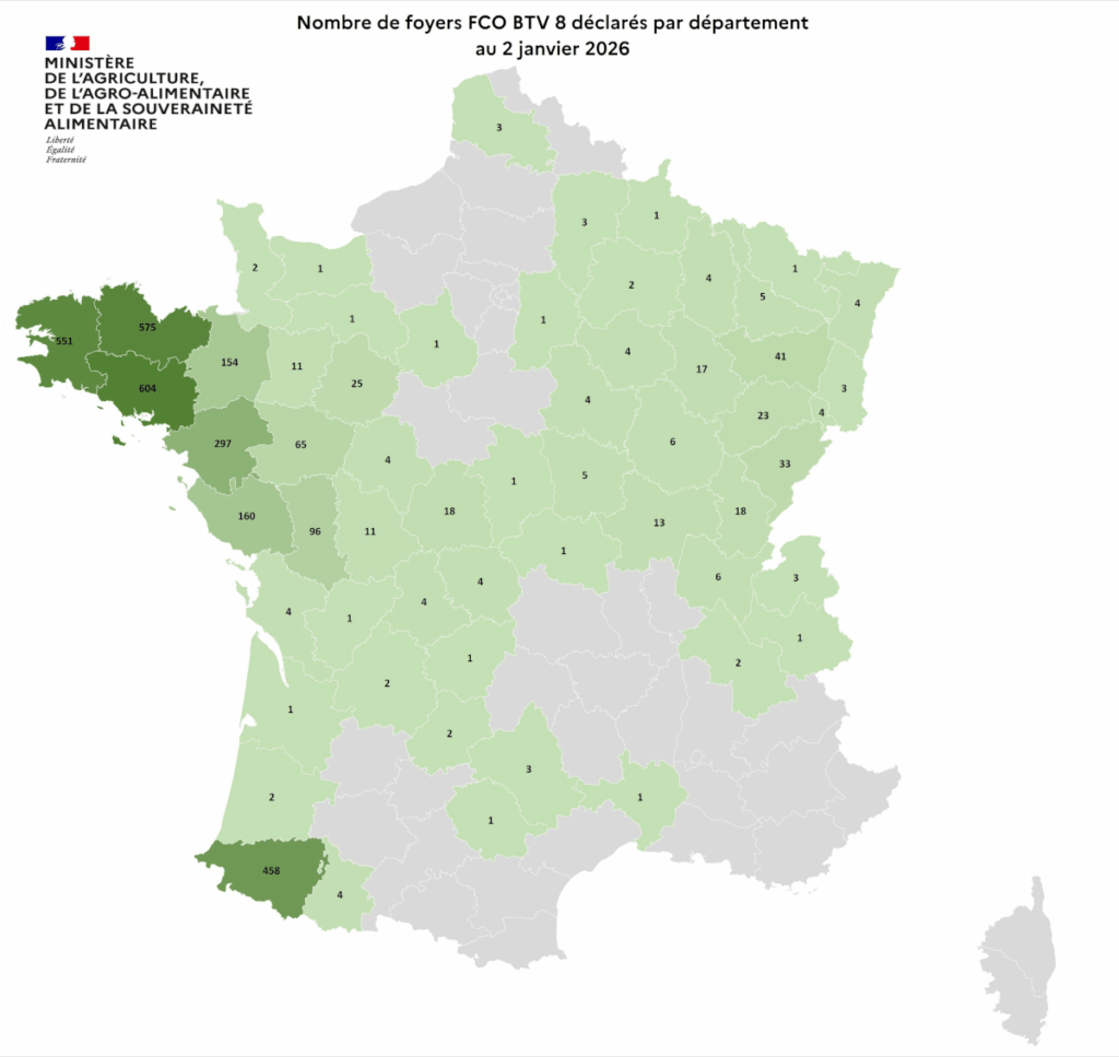 Entre le 1er juin et le 2 janvier 2026, 3 273 foyers de FCO, sérotype 8, ont été recensés en France (+22 foyers depuis la semaine dernière)