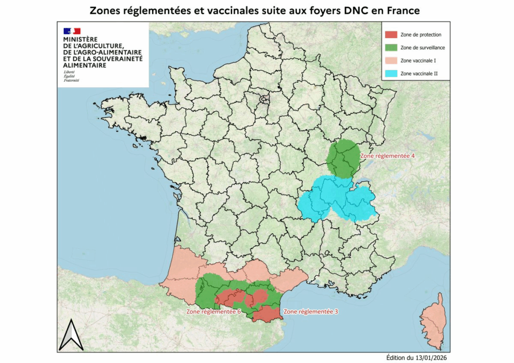 À la date du 15 janvier 2026, 92,1 % du cheptel des dix départements du Sud-Ouest concernés est vacciné, soit 664 938 bovins vaccinés.