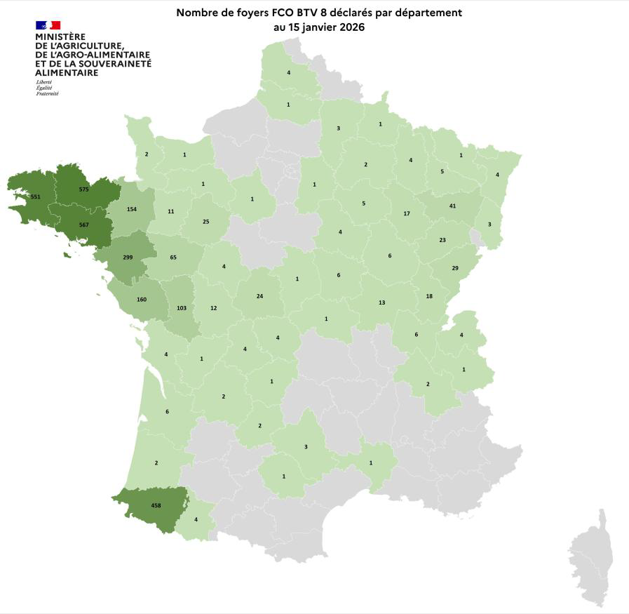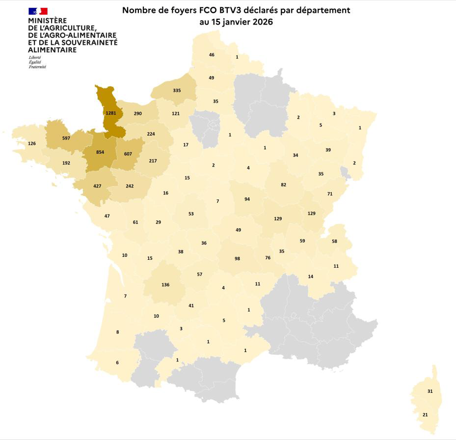 Entre le 1er juin et le 15 Janvier 2026, 7366 foyers de FCO, sérotype 3, ont été recensés en France (+78 foyers depuis la semaine dernière)