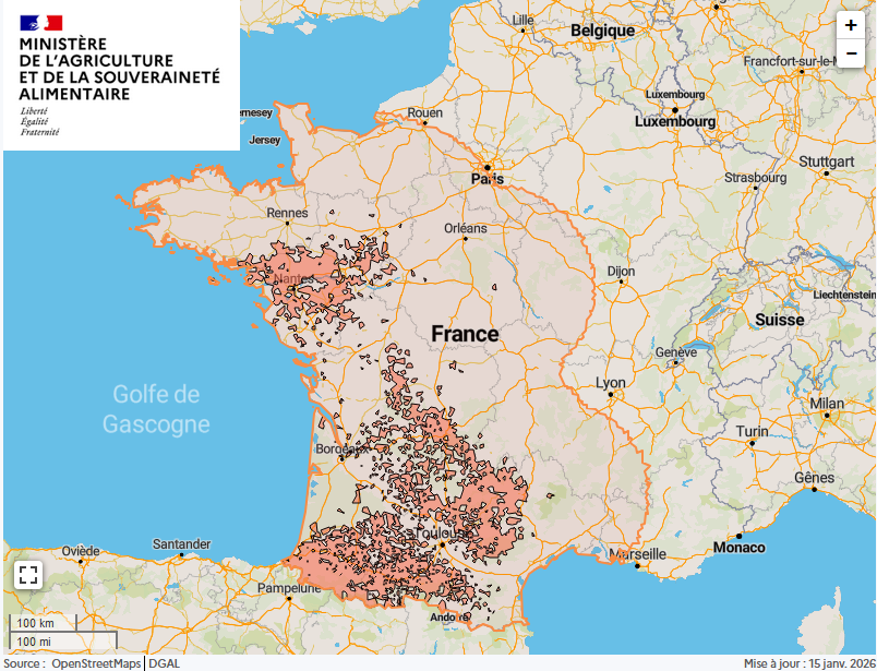 Les départements de Haute-Pyrénées et du Gers ont levé la zone de protection prise suite au foyer unique dans les Hautes-Pyrénées (foyer de Luby Betmont confirmé le 12 décembre dernier). Cette zone est devenue une zone de surveillance, de même statut que la zone de surveillance déjà en place autour de ce foyer.