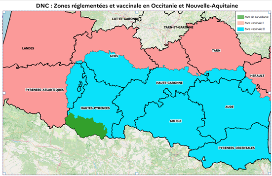 Le zonage autour de ce foyer englobe une partie du département du 65, dont 26 communes passent en zone de surveillance (cf carte ci-dessous). Ce cas dans un élevage non vacciné rappelle la nécessité d’une couverture vaccinale maximale dans les zones de vaccination.