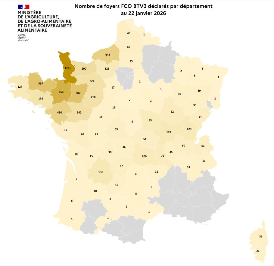 Entre le 1er juin et le 15 Janvier 2026, 7496 foyers de FCO, sérotype 3, ont été recensés en France (+130 foyers depuis la semaine dernière)