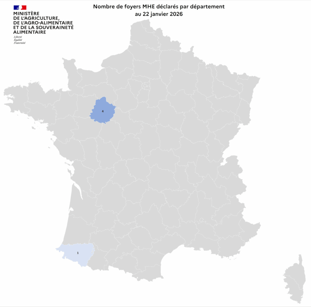 Entre le 1er juin et le 15 janvier 2026, 5 foyers de maladie hémorragique épizootique (MHE) ont été recensés en France
