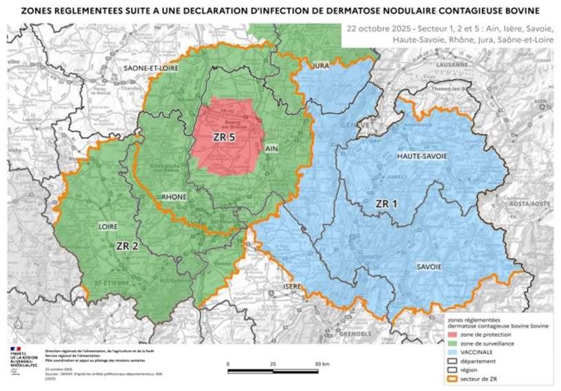 Ci dessous, la nouvelle carte en vigueur avec le passage en Zone vaccinale de l’ex-ZR1 (hors fraction emportée par la ZR5)