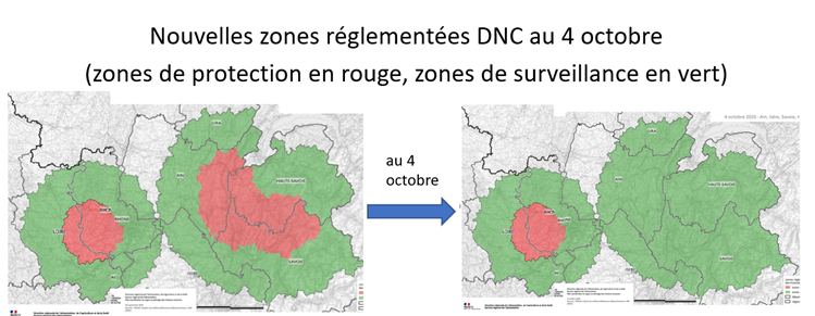 Depuis le 4 Octobre, la zone de protection mise en place autour des foyers de DNC survenus entre le 29/06 et le 06/09 (ZP1) est levée.