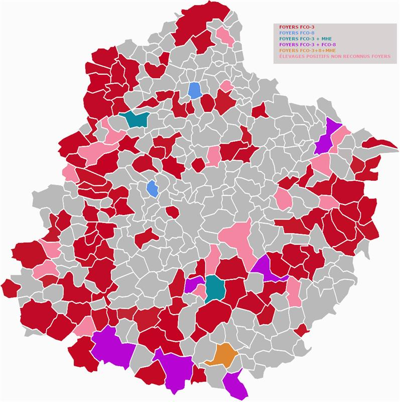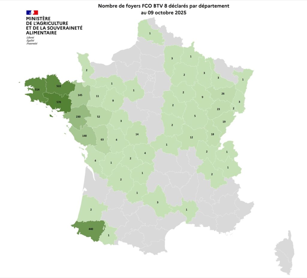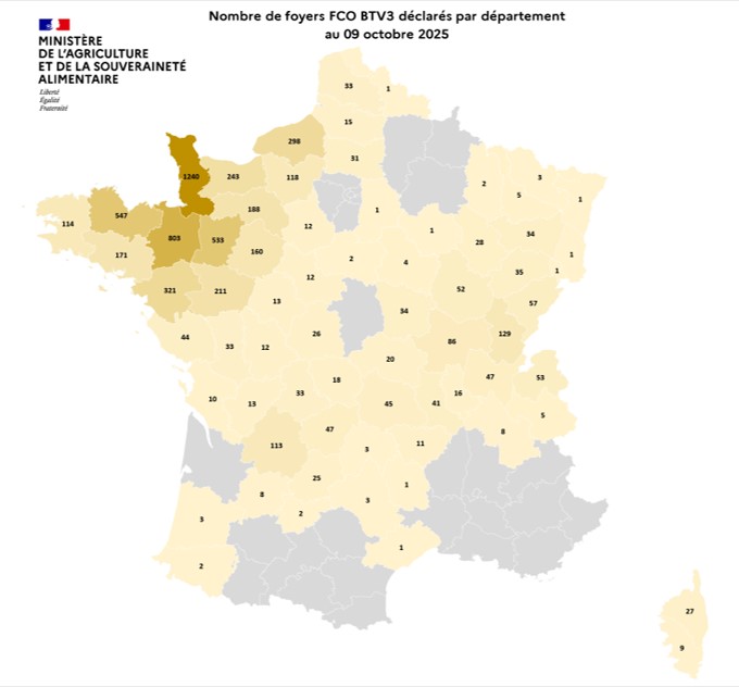 Entre le 1er juin et le 09 Octobre 2025, 2 895 foyers de FCO, sérotype 8, ont été recensés en France (+70 foyers depuis la semaine dernière)